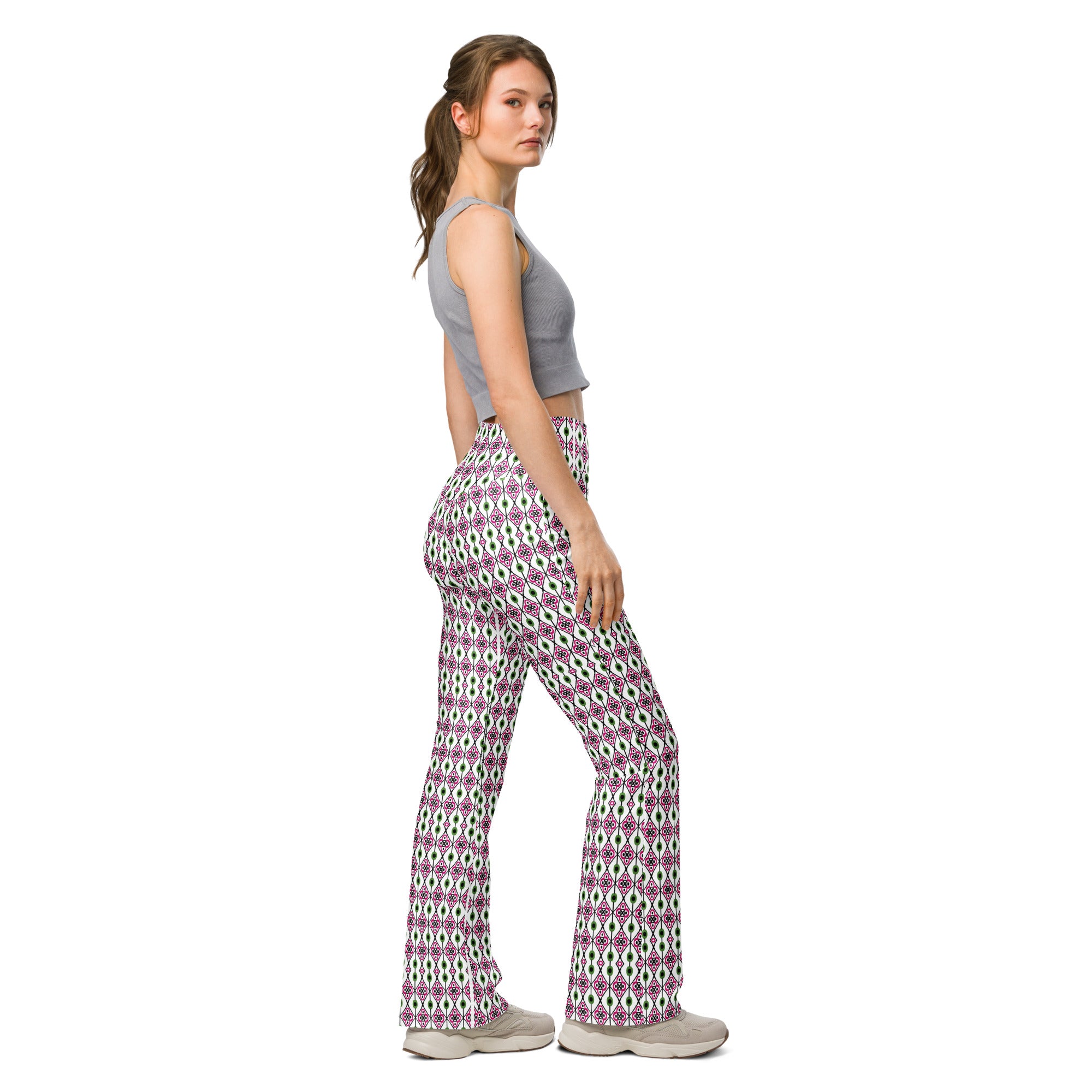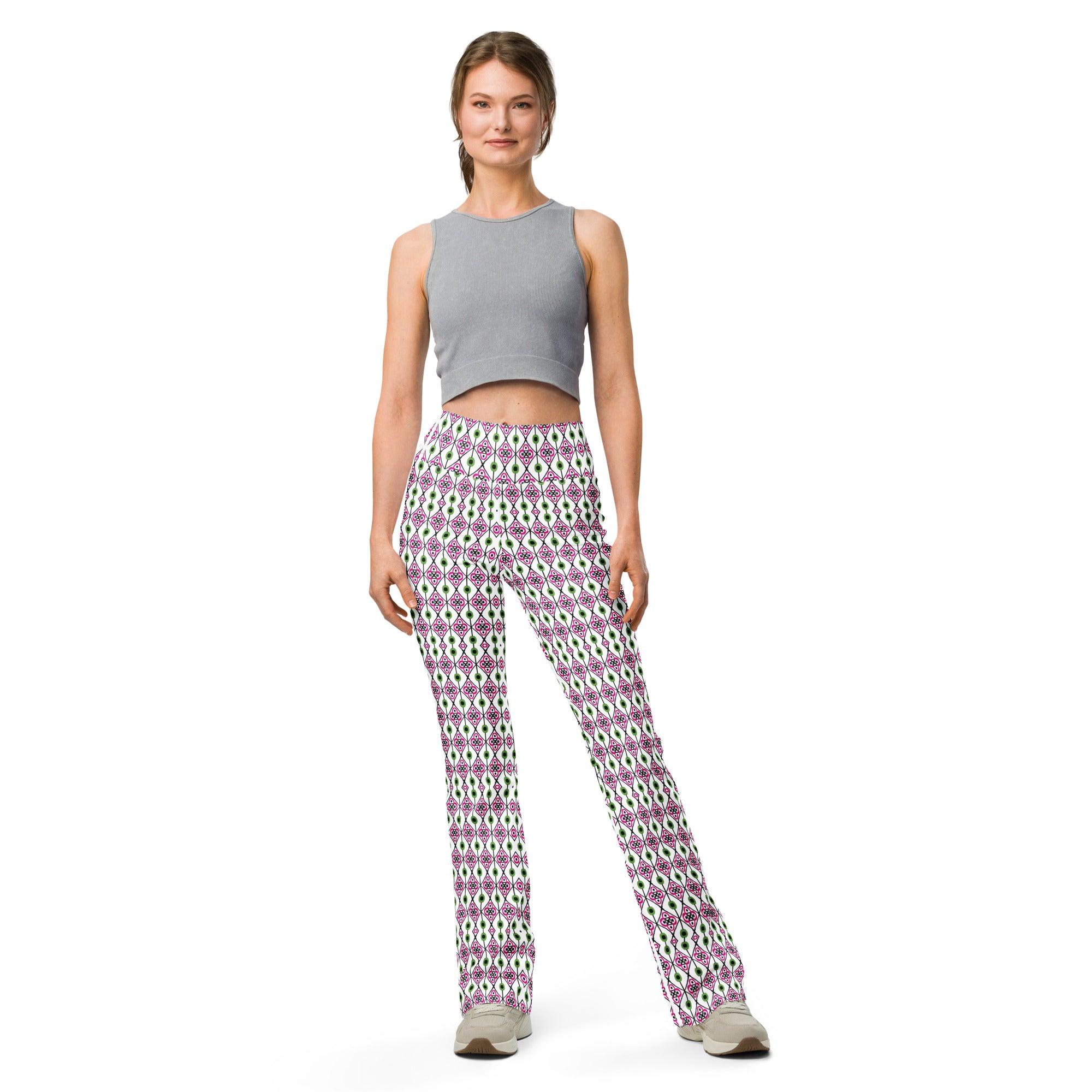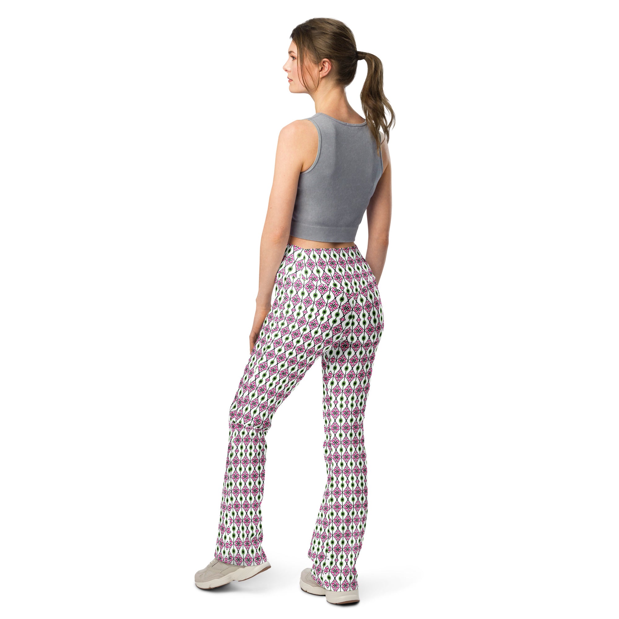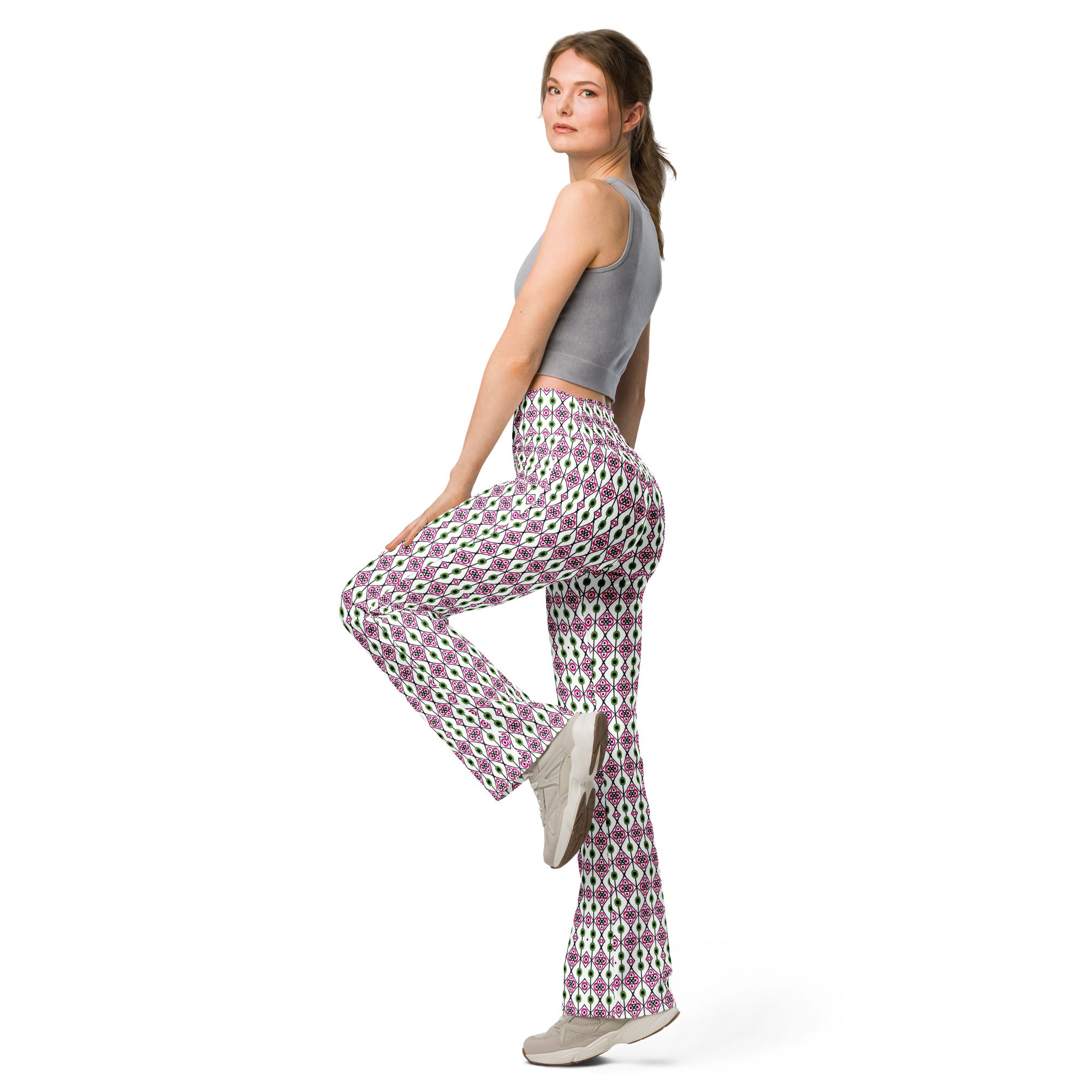 The Green Diamonds | Eco-Friendly | Flare Leggings combine fashion with function, boasting key features that deliver comfort and style: a high waist and butt-lifting cut for a flattering fit, a flared design from the knee down adding a modern twist, and moisture-wicking fabric to keep you dry and comfortable whether you’re walking, hitting the gym, or layering up with a bomber jacket or hoodie. The soft, stretchy premium fabric provides mild compression, enhancing your silhouette while supporting ease of movement.