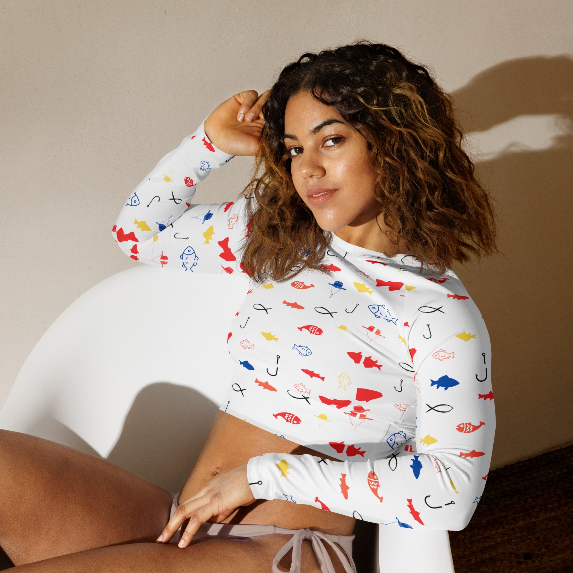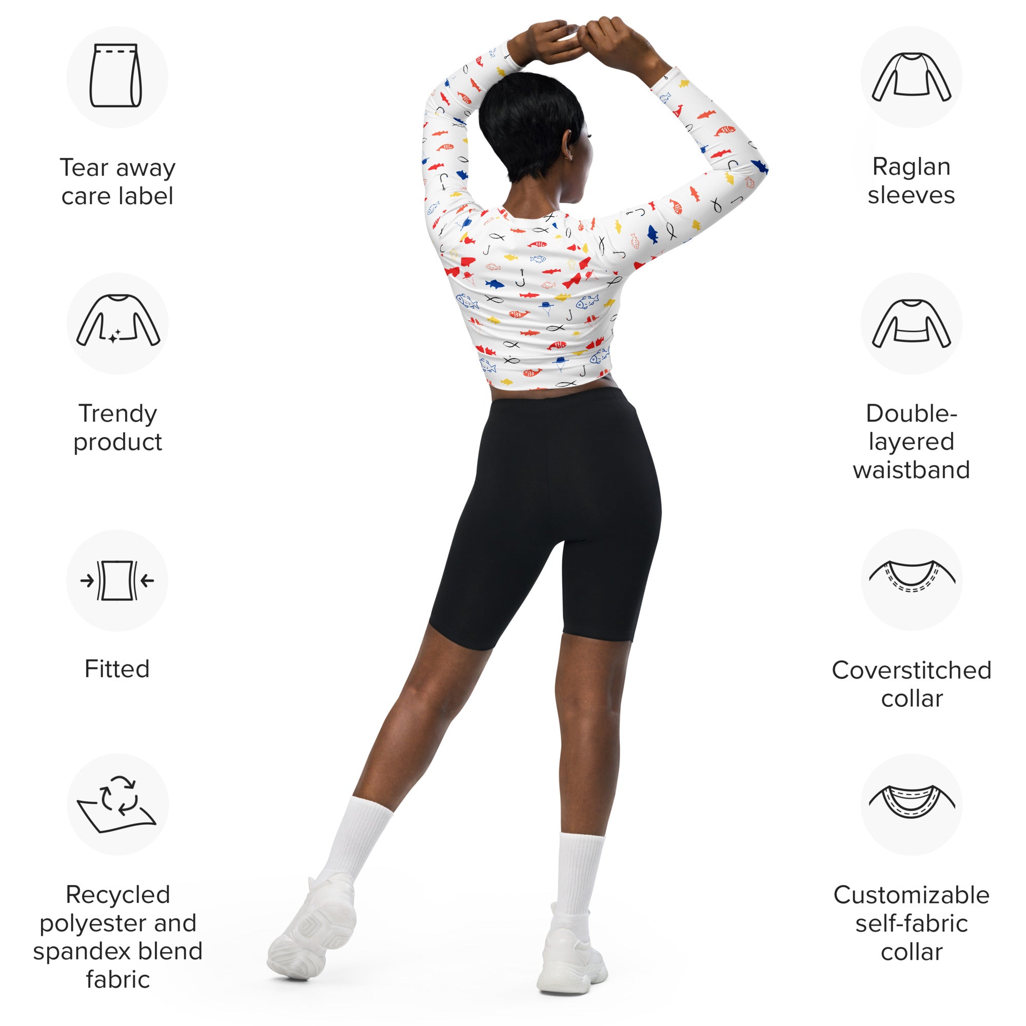 Crafted sustainably, the Fish Fiesta crop top features:
